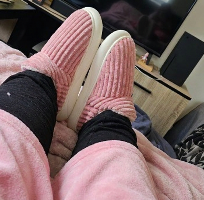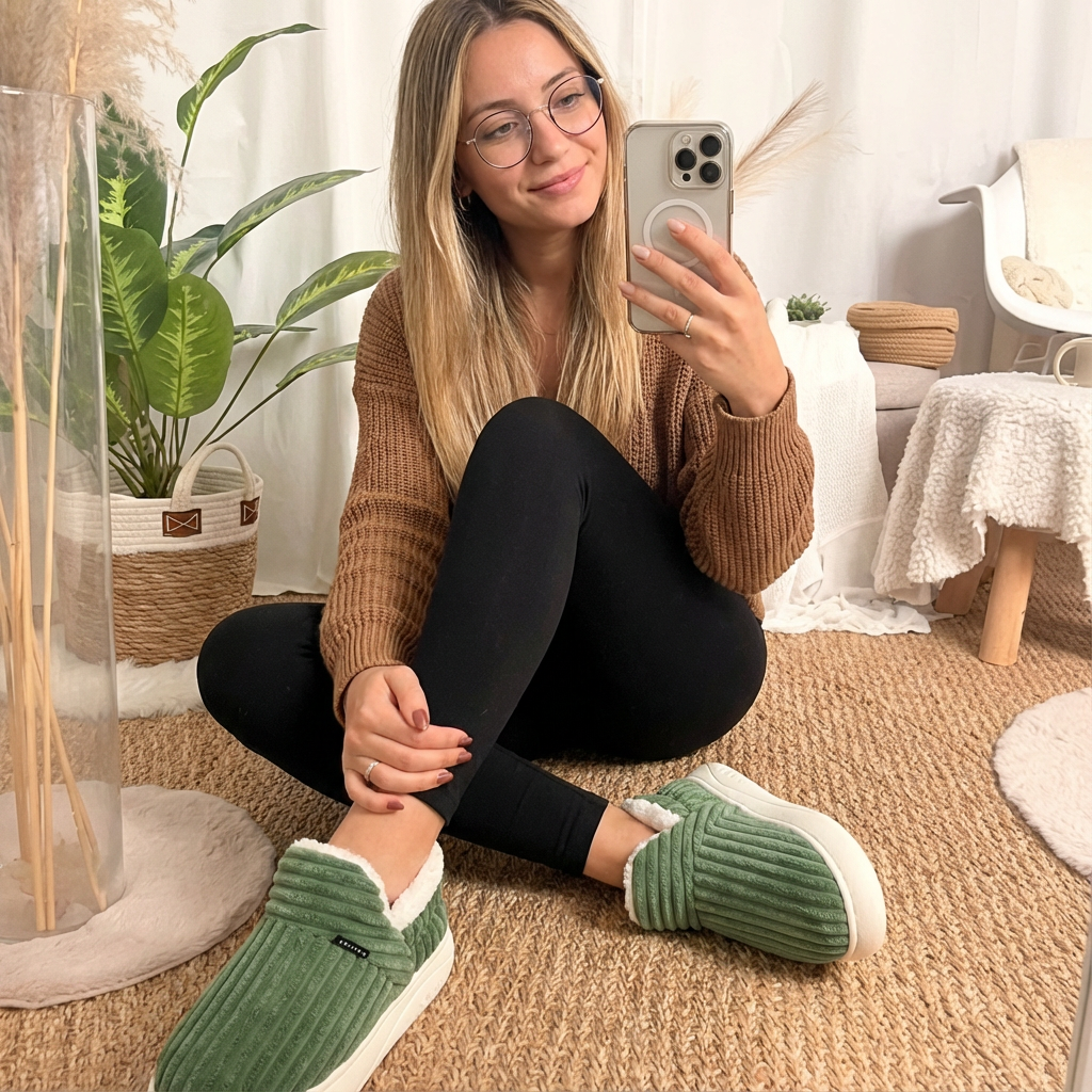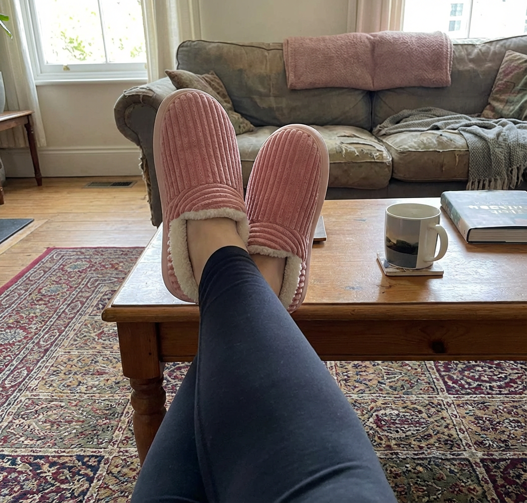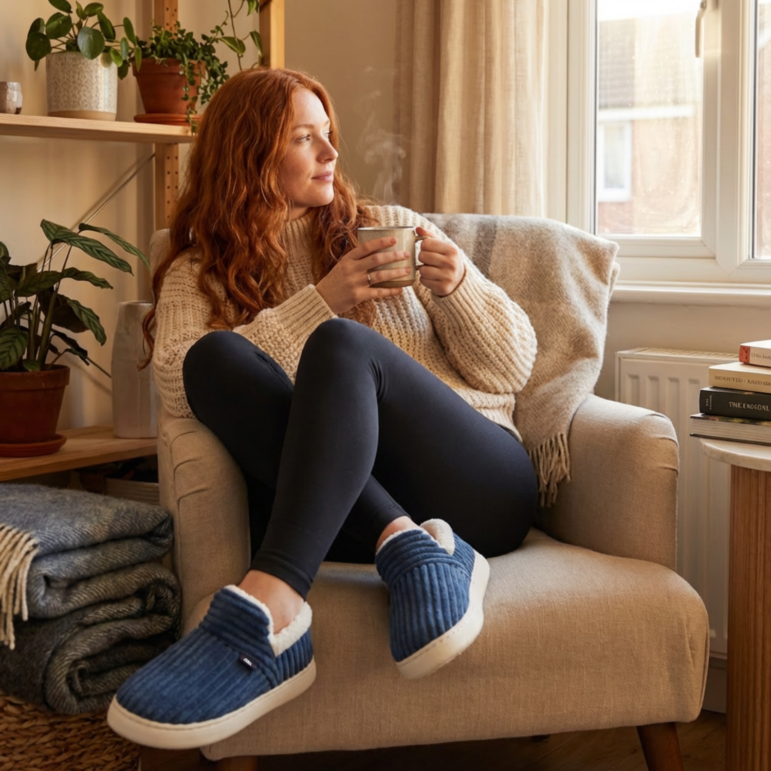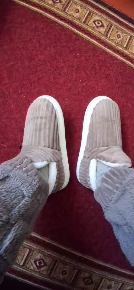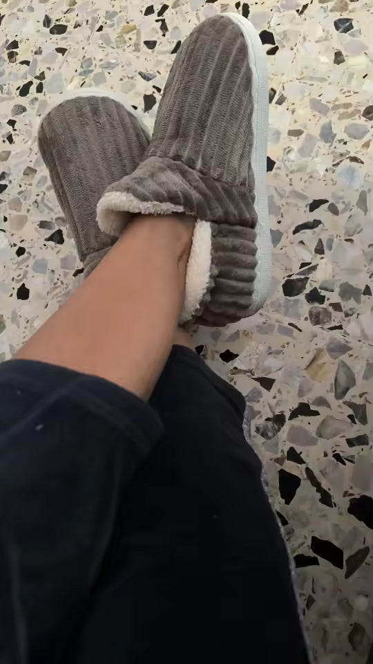 Queste pantofole in velluto a coste con fodera soffice offrono un comfort immediato e mantengono i piedi al caldo tutto il giorno. La suola antiscivolo assicura stabilità, mentre il design elegante le rende perfette per rilassarsi in casa con stile.